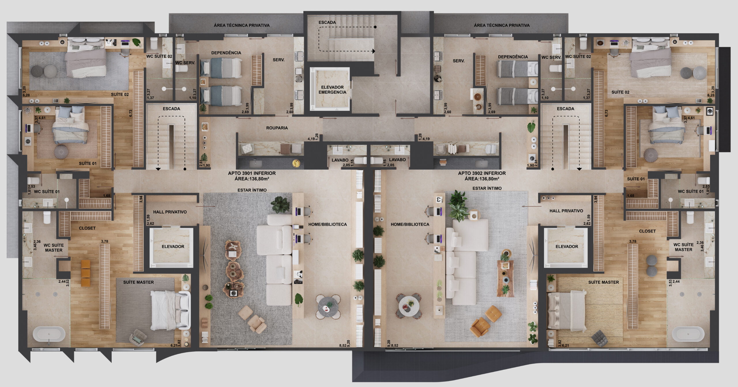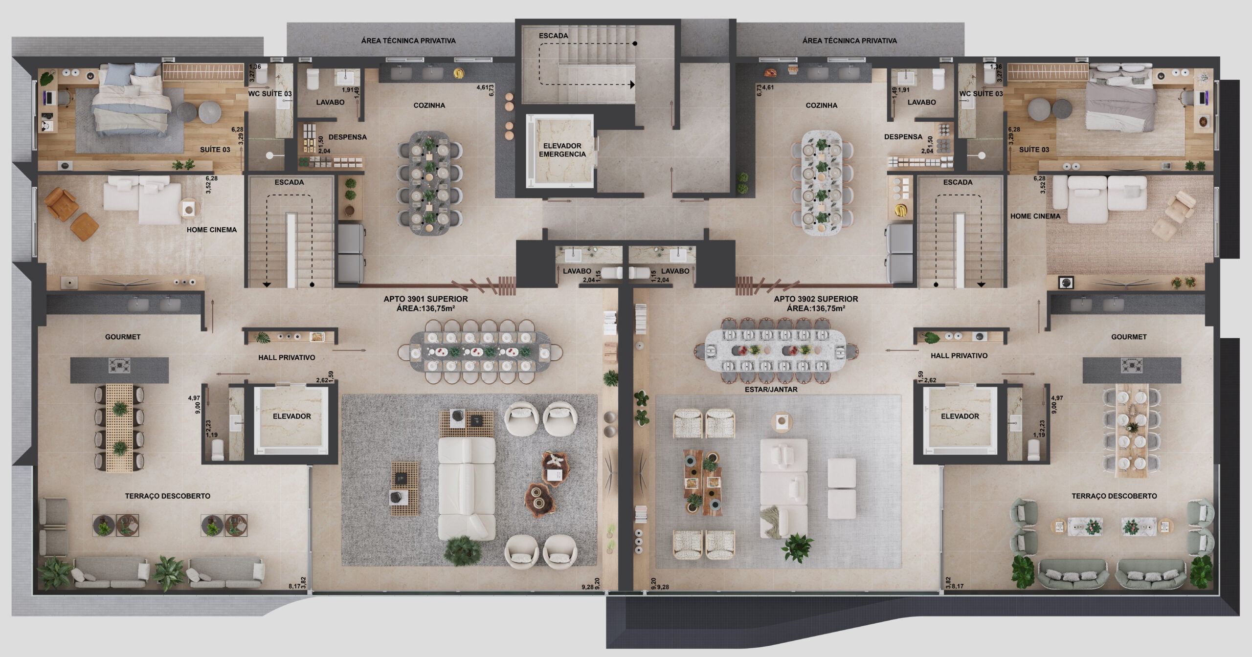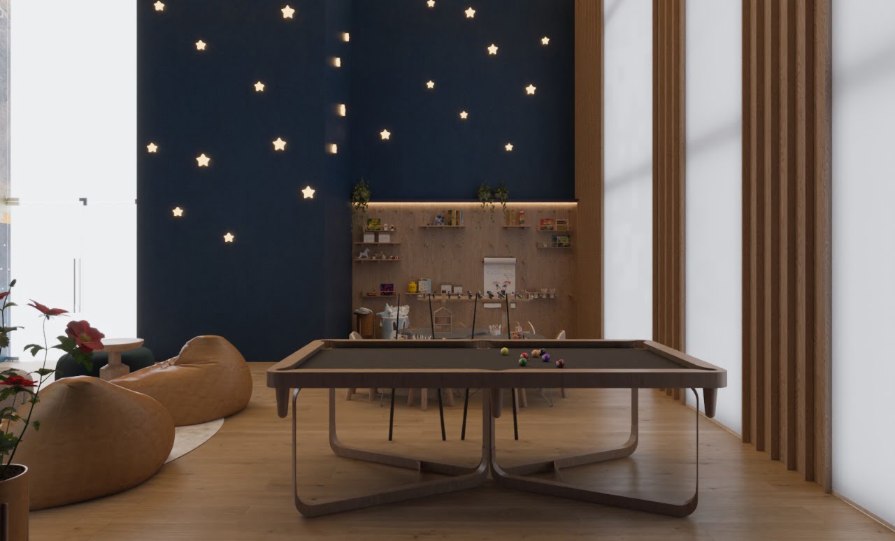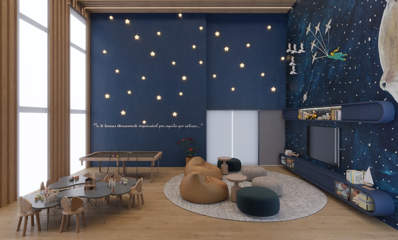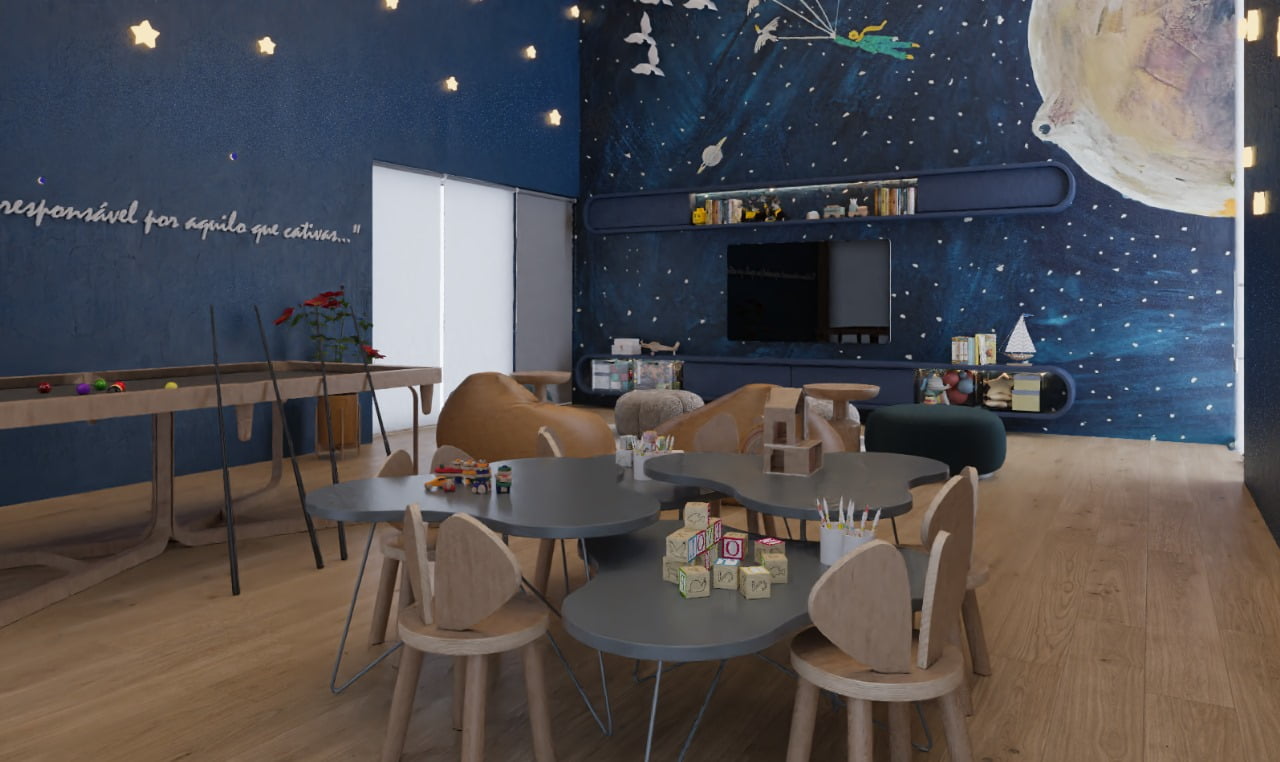 A distribuição dos espaços comuns foi cuidadosamente pensada para traduzir um conceito de arquitetura formal, sofisticada e atemporal, oferecendo mais de 20 itens de lazer e comodidades para toda família.